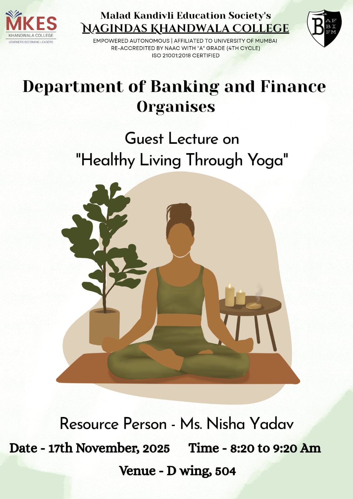 • - Guest lecture on “Healthy Living through Yoga” By Ms. Nisha Yadav for SYBAF- A and SYBFM class (Dept of Banking and Finance) on 17th November 2025 Brochure