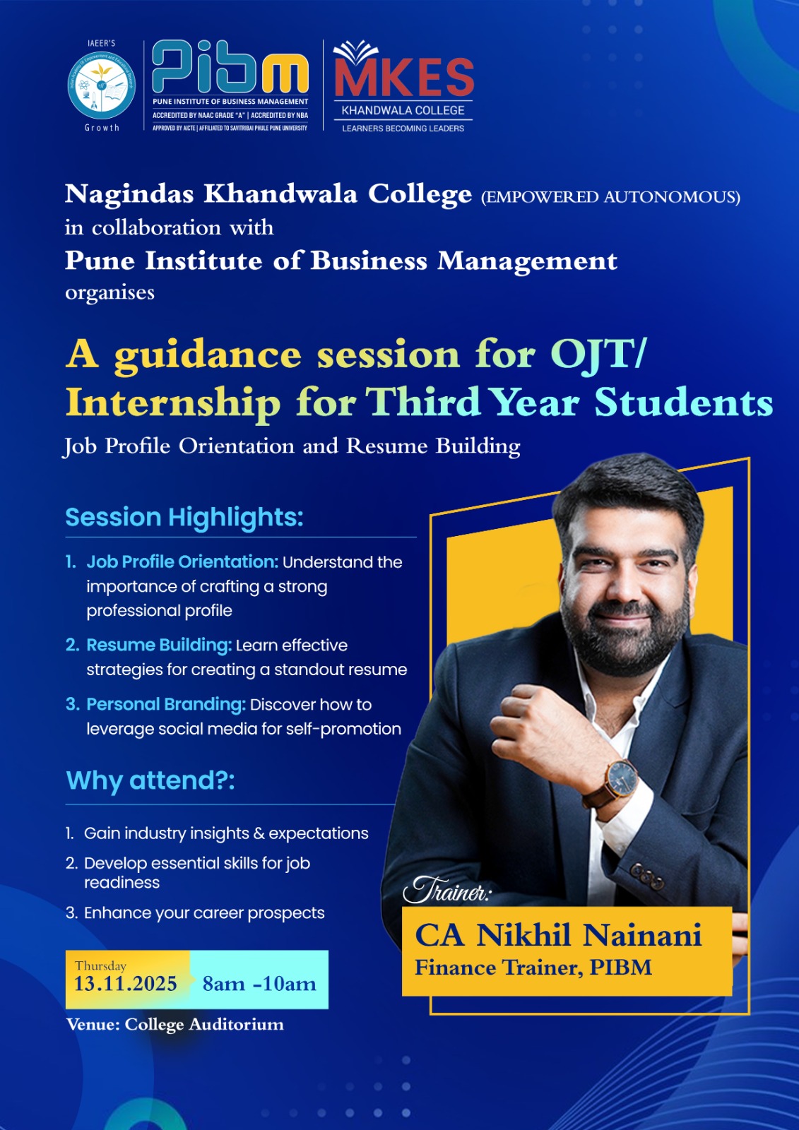 • - Guidance session for OJT internship for Third Year Students on Job Profile Orientation and Resume Building organized by Dept. of Accountancy in collaboration with Pune Institute of Business Management on 13th November 2025 Brochure